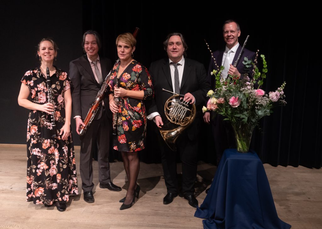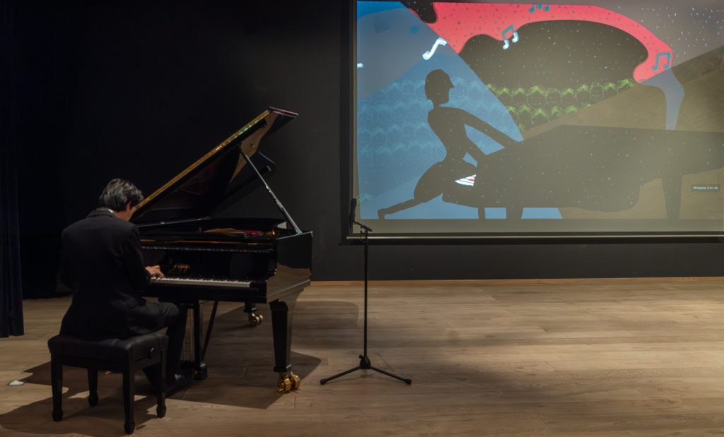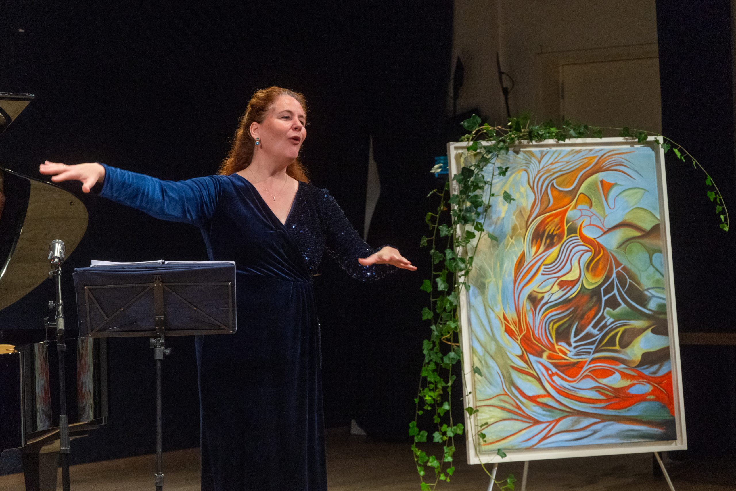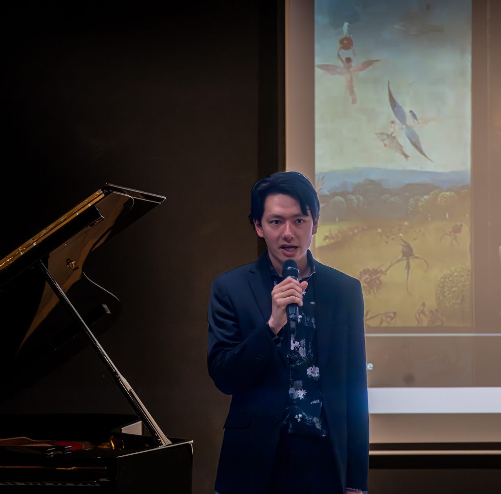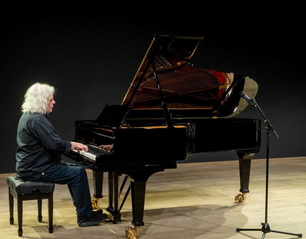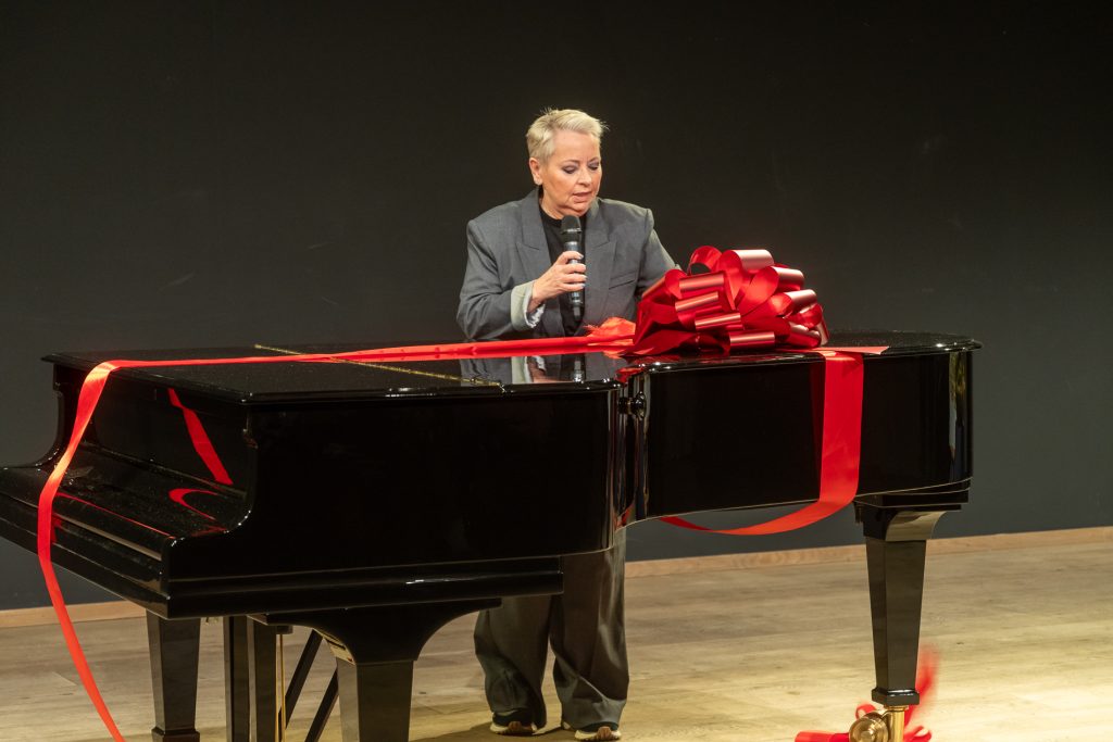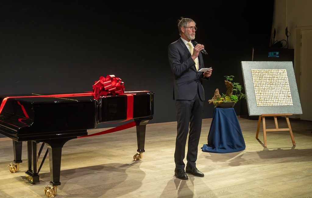 Voorzitter Leendert Klok naast de nieuwe Steinway vleugel. Rechts een kunstwerk van Else J. Dekker.