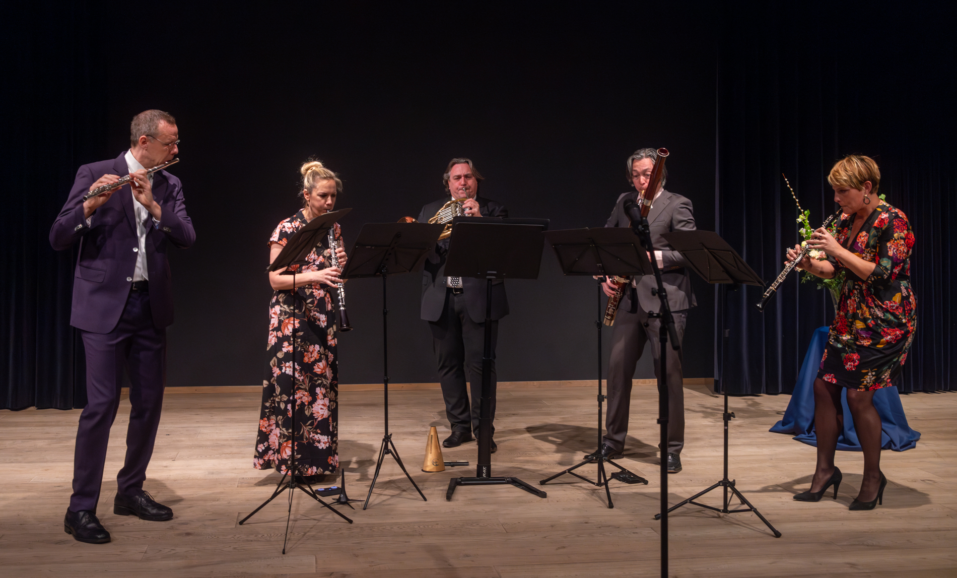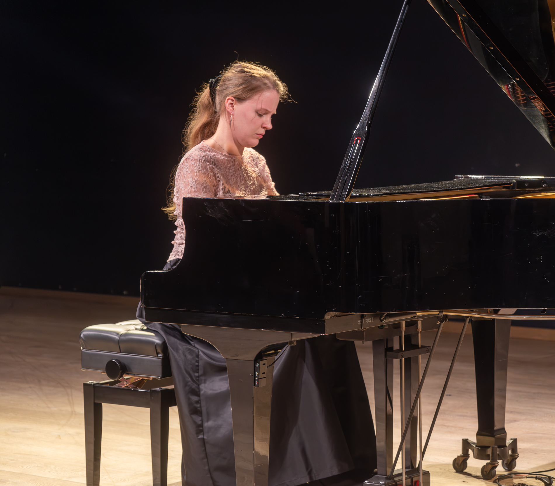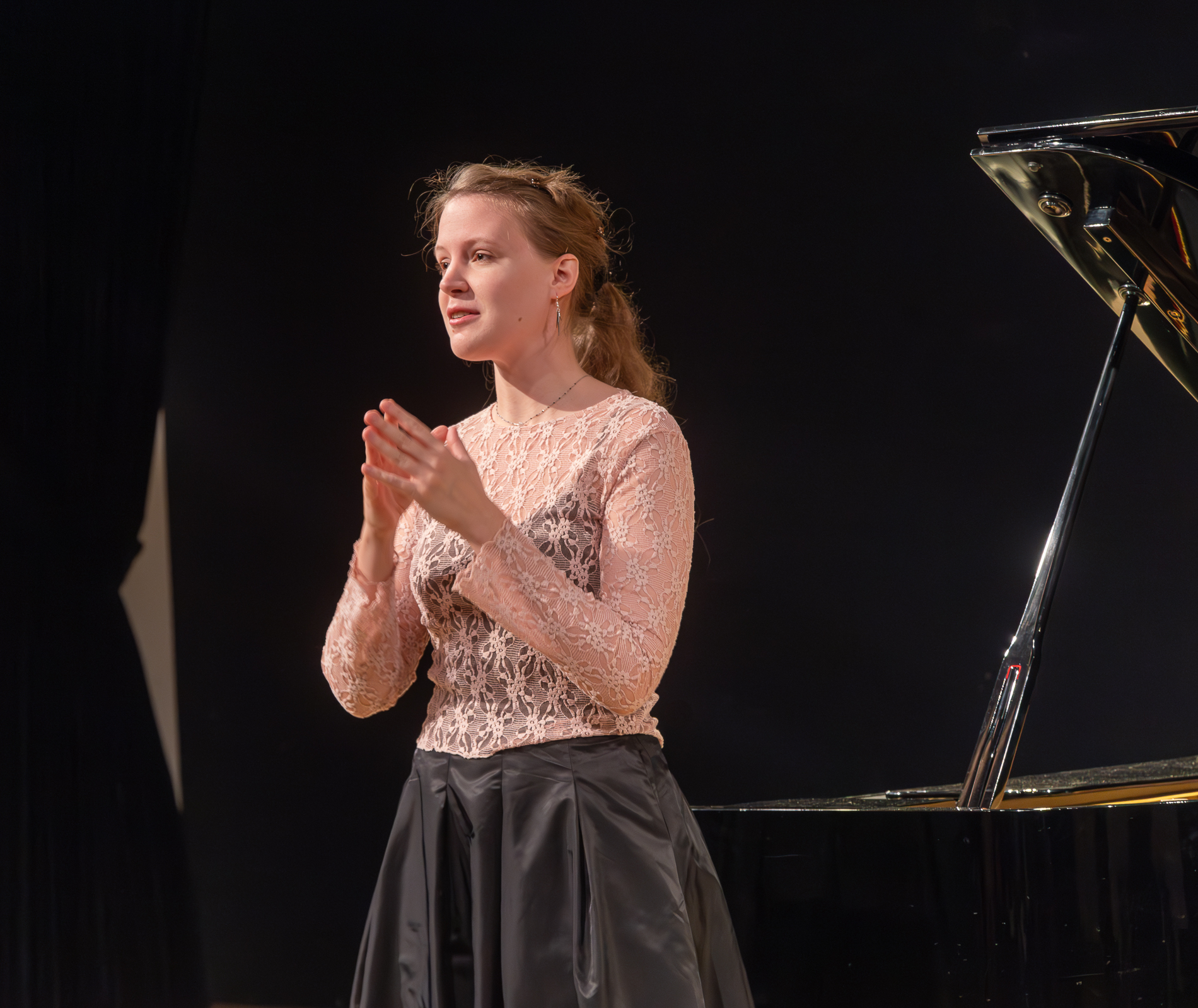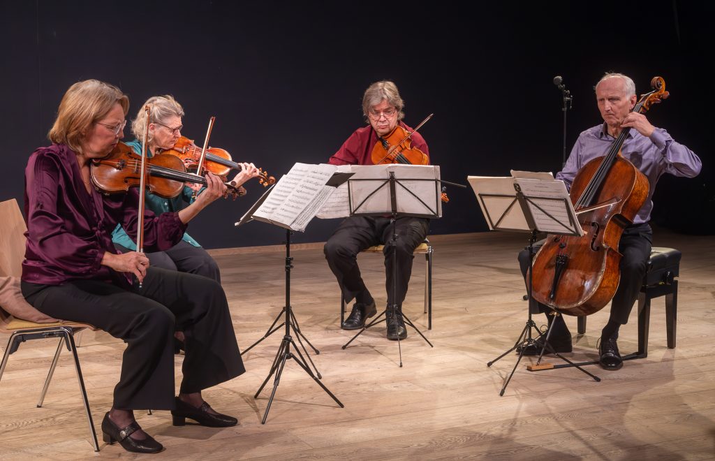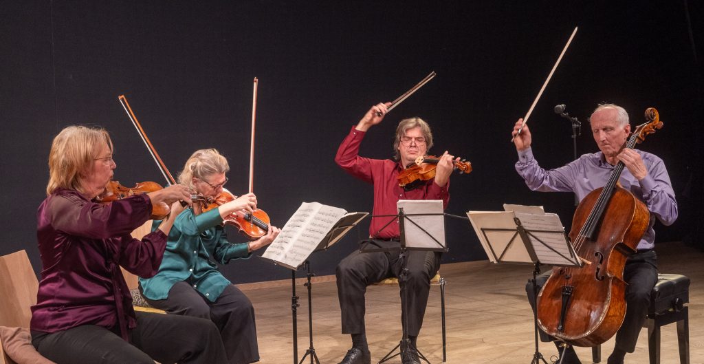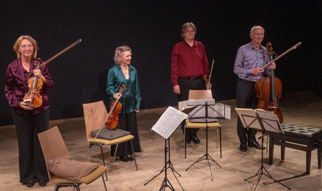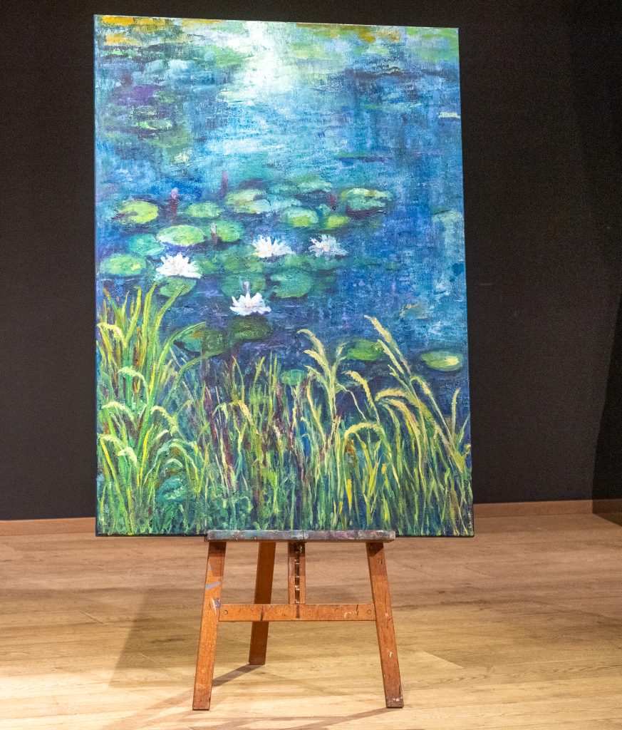 Voorzitter Leendert Klok naast de nieuwe Steinway vleugel. Rechts een kunstwerk van Else J. Dekker.
